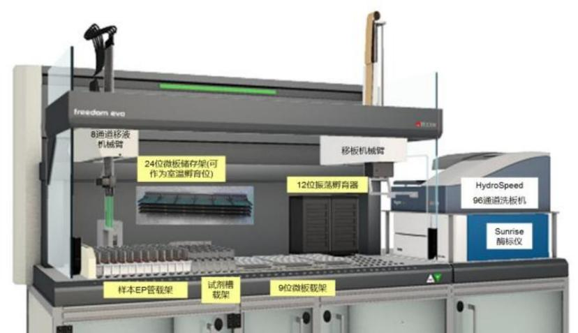 瑞士Tecan Freedom EVO150全自动酶免工作站能够全自动完成酶联免疫吸附实验的整个过程,包括稀释、加样、加质控品和对照品、孵育、洗板、读数、结果判读等过程;全自动酶免分析系统是提高实验精度、提高实验效率和避免人为误差和差错的关键设备。